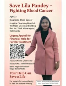 लिला बचाउ अभियान : बाँच्ने आशामा लडिरहेकी लिला पाण्डे ! सबै मिलेर साथ दिऔं – सानो सहयोगले ठूलो चमत्कार गर्न सक्छ तानसेन, पाल्पा – तानसेन नगरपालिका–१४, अर्गलीकी २२ वर्षीया लीला पाण्डे अहिले अस्पतालको शैयामा जीवन र मृत्युबीच लडिरहेकी छिन्। उनका बुबाआमा अनन्त प्रसाद पाण्डे र मुना पाण्डे सामान्य कृषक परिवारका हुन्। पाँच छोरीहरूको परिवारमा लीला न जेठी, न कान्छी — काइली छोरी। सबैभन्दा बढी घरको भर बोक्ने, मिहिनेती, समझदार र सहनशील। अहिले त्यो छोरी चुपचाप ICU मा छ, आँखाभरि आशा बोकेर — बाँच्न सकूँ भनेर। जेठ १२ गते, लिलालाई ज्वरो र कमजोरी देखिएपछि कृमसन अस्पताल, बुटवल लगियो। ६ पोका रगत चढाइयो तर सुधार नआएपछि तुरुन्तै टिचिङ अस्पताल, काठमाडौँ सारियो। १४ गते, ब्लड क्यान्सरको शंका गर्दै नमुना भारत पठाइयो। केही दिनमै पुष्टि भयो — लीला Acute Leukemia (ब्लड क्यान्सर) बाट पीडित छिन्।