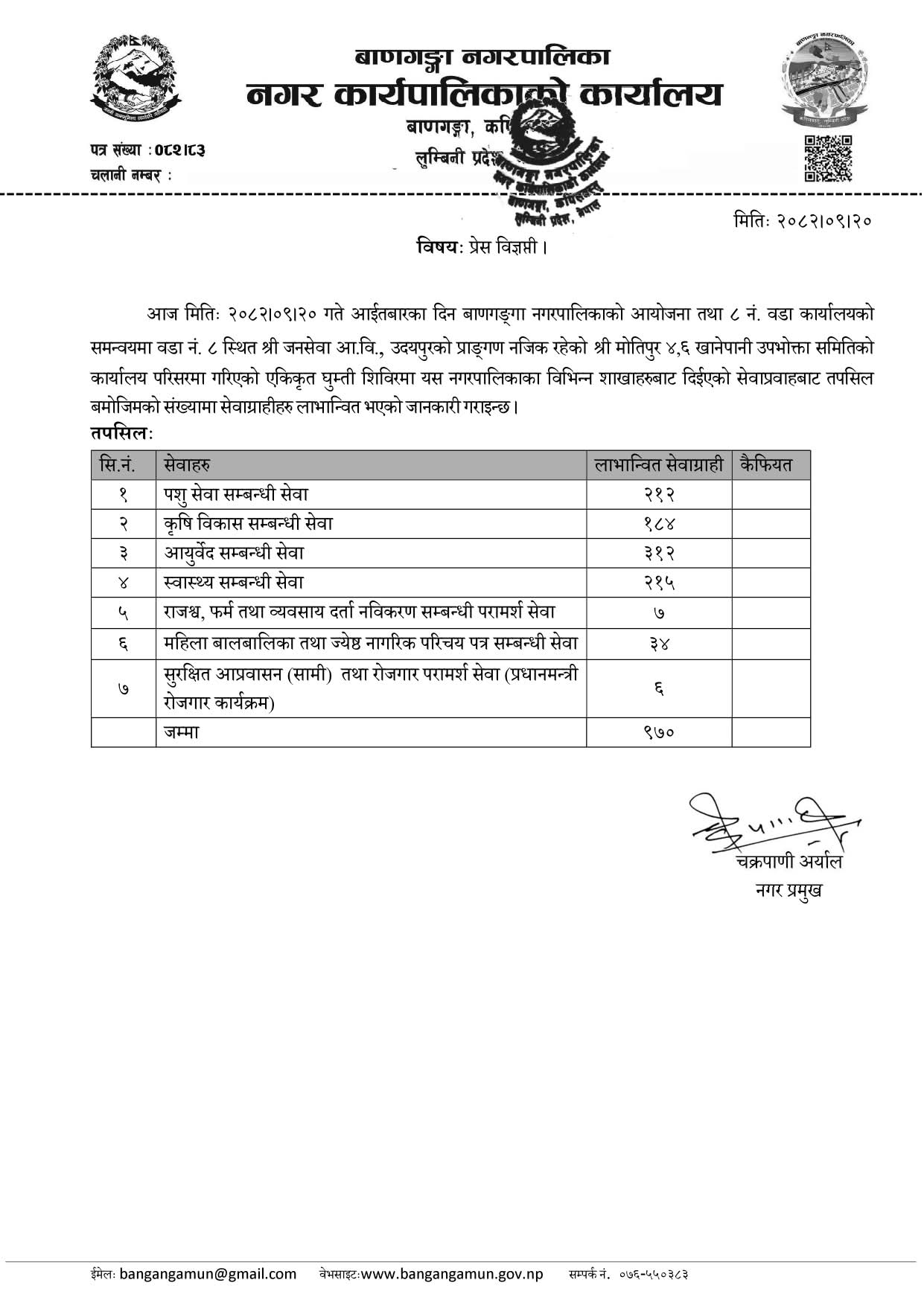 शिविरमा पशु सेवा सम्बन्धी २ सय १२ जना, कृषि विकास सम्बन्धी १ सय ८४ जना, आयुर्वेद सेवा सम्बन्धी ३ सय १२ जनाले सेवा लिएका छन्। यस्तै स्वास्थ्य सेवा अन्तर्गत २ सय १५ जना लाभान्वित भएका छन् भने राजश्व, फर्म तथा व्यवसाय दर्ता तथा नविकरण सम्बन्धी परामर्श सेवा ७ जनाले लिएका छन्। महिला, बालबालिका तथा ज्येष्ठ नागरिक परिचयपत्र सम्बन्धी ३४ जना र सुरक्षित आप्रवासन (सामी) तथा रोजगार परामर्श सेवा ६ जनाले लिएको प्रेस विज्ञप्तीमार्फत जानकारी गराइएको छ।