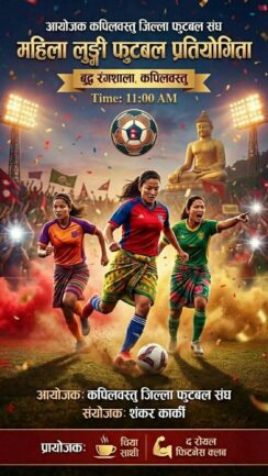 कपिलवस्तु जिल्लामै पहिलो पटक आज शनिबार महिला लुङ्गी फुटबल प्रतियोगिता हुदै छ । उक्त प्रतियोगिता कपिलवस्तु जिल्ला फुटबल संघको आयोजनामा हुन लागेको हो ।