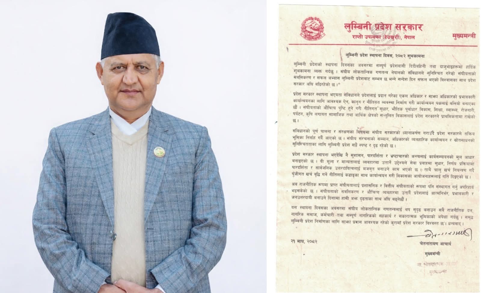 लुदस, दाङ । लुम्बिनी प्रदेशका मुख्यमन्त्री चेतनारायण आचार्यले संघीयताको सवलिकरण र सफल अभ्यास लुम्बिनी प्रदेशबाट सम्भव भएको सन्देश देशभर दिन सफल भएको बताउनुभएको छ । प्रदेश स्थापना दिवसको अवसरमा बुधवार एक शुभकामना सन्देश जारी गर्दै मुख्यमन्त्री आचार्यले प्रदेशलाई आत्मनिर्भर, प्रभावकारी र जनउत्तरदायी बनाउने दिशामा सरकार दृढताका साथ अघि बढिरहेको स्पष्ट पार्नुभएको हो ।