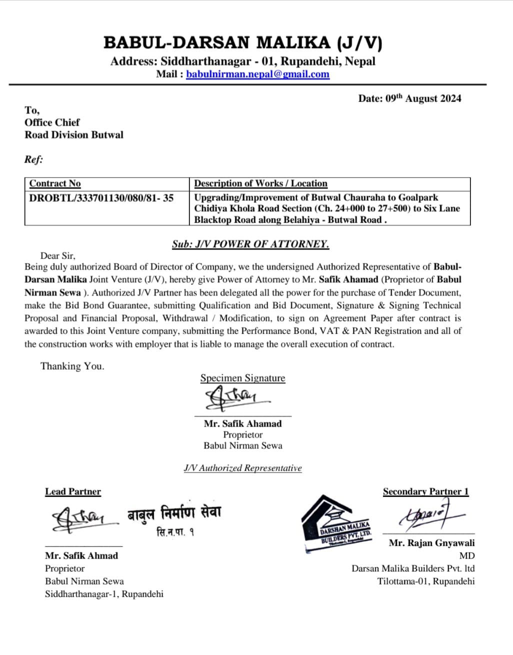 बाबुल निर्माण सेवाका सञ्चालक सफिक अहमद हुन तर केही महिना अघि उनको निधन भए पश्चात् उक्त फर्म सफिकको छोरा नफिस खाँको नाममा दर्ता रहेको छ। बुटवल राजमार्ग चौराहादेखि गोलपार्कसम्मको सडक निर्माणमा बाबुल निर्माण सेवा लिड पार्टनर र दर्शन मालिका सहायक पार्टनरका रूपमा छन्। दर्शन मालिका कम्पनीका सञ्चालक नेपाल निर्माण उद्योग परिषद् रुपन्देहीका अध्यक्ष राजन ज्ञवाली रहेका छन्।