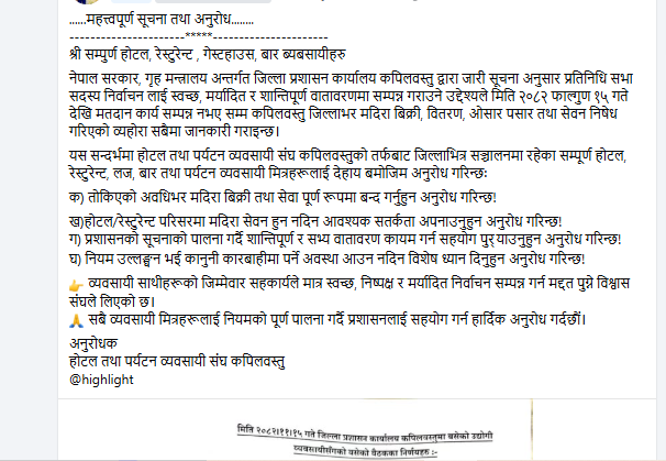 होटल तथा पर्यटन व्यवसायी संघ कपिलवस्तुले सम्पुर्ण होटल, रेस्टुरेण्ट, गेस्ट हाउस, तथा बार ब्यबसायीहरुलाई सचेत गराएको छ । नेपाल सरकार, गृह मन्त्रालय अन्तर्गत जिल्ला प्रशासन कार्यालय कपिलवस्तुद्वारा जारी सूचना अनुसार प्रतिनिधि सभा सदस्य निर्वाचन लाई स्वच्छ, मर्यादित र शान्तिपूर्ण वातावरणमा सम्पन्न गराउने उद्देश्यले मिति २०८२ फाल्गुण १५ गते देखि मतदान कार्य सम्पन्न नभए सम्म कपिलवस्तु जिल्लाभर मदिरा बिक्री, वितरण, ओसार पसार तथा सेवन निषेध गरिएको व्यहोरा सबैले पालना गरिदिनुहुन संघले अनुरोध गरेको छ ।
